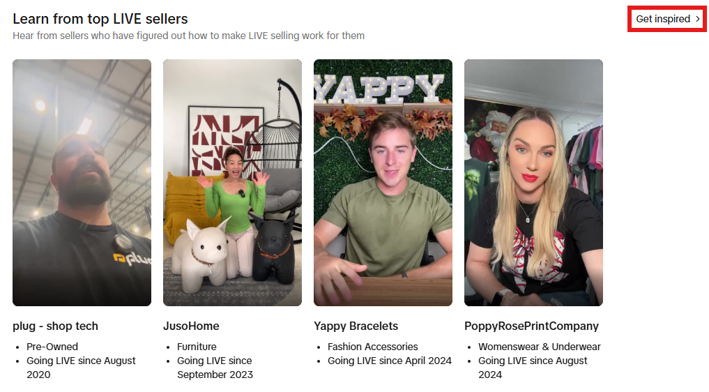 Step 6: The fourth section, Learn from top LIVE sellers, highlights sellers who perform well on LIVE. Select Get Inspired in the top right corner to explore more examples.